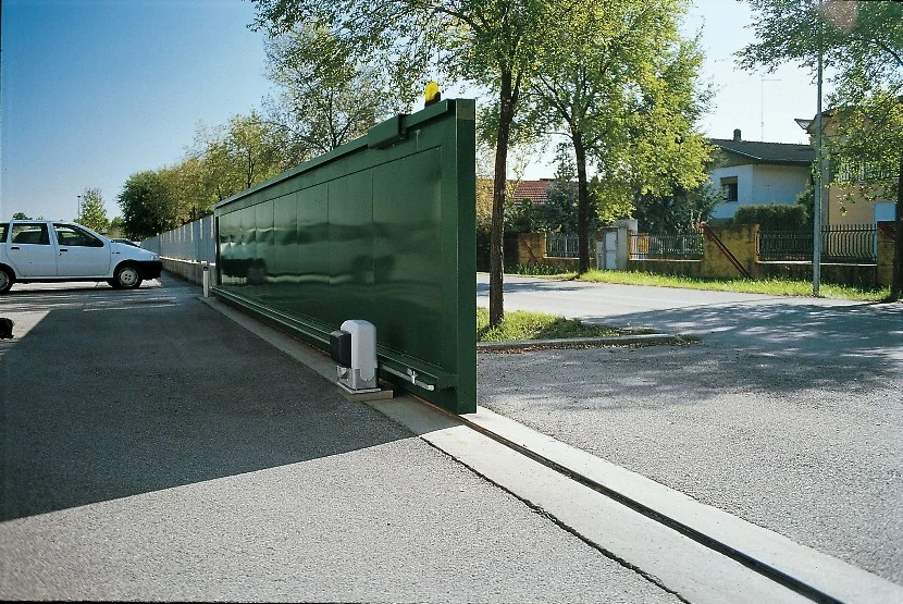 Nei cancelli scorrevoli il motore viene posizionato a terra e trasferisce il moto all’anta mobile attraverso l’asta cremagliera che viene fissata al serramento.